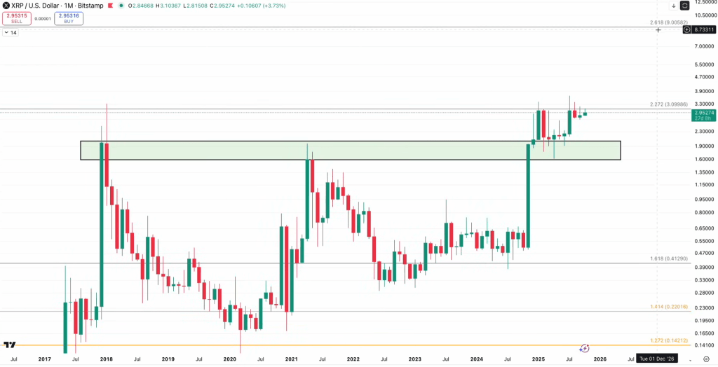 “瑞波币 仍在与 3.10 USD地区抗争……这是 2.272 斐波那契扩展水平……大家从未见过月线收盘价高于 309986 USD,”他说道,并指出相同的扩展网格“恰好是 2025 年的最高点”,而“低于 1.272 USD的扩展线则是 2025 年 4 月的最低点”。在他看来,这种汇合为下一个扩展目的提供了可信度:“下一个水平是 9 USD……所以本质上,这只不过时间问题。”
