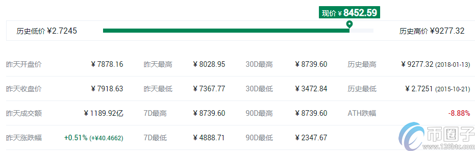 BTC市值7373.23亿USD,流通数目1859.09万,24小时成交额269.84亿USD。