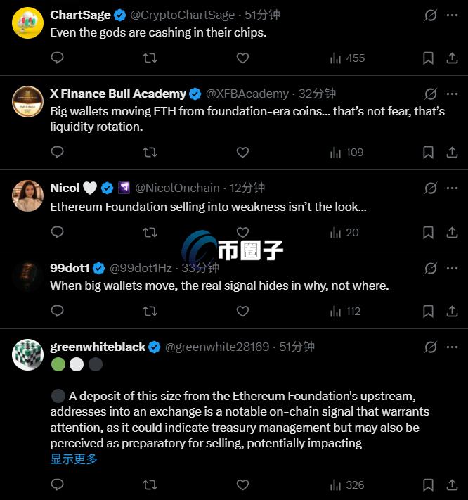 不过值得注意的是,正是因为ETH基金会尚未对这笔资金变动进行说明,也引发了加密社群的各种猜测,有人看戏、也有人表示紧张,有人感觉是ETH基金会的常规资金管理,也有人直接喊出「基金会在逃顶」,但大部分人都把这笔资金变动当成「后续会有大动作」的讯号。以下摘取部分社群评论: