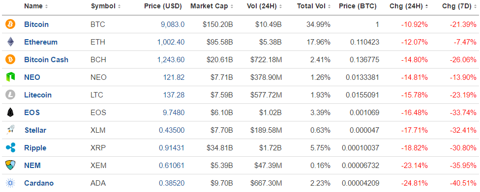 市值排名前十的数字虚拟货币全线下跌,从24小时涨跌幅来看,BTC下跌10.9%,跌幅最小;ETH仅下跌12%;跌幅最大的Candaro和NEM分别跌24.8%和23.14%。