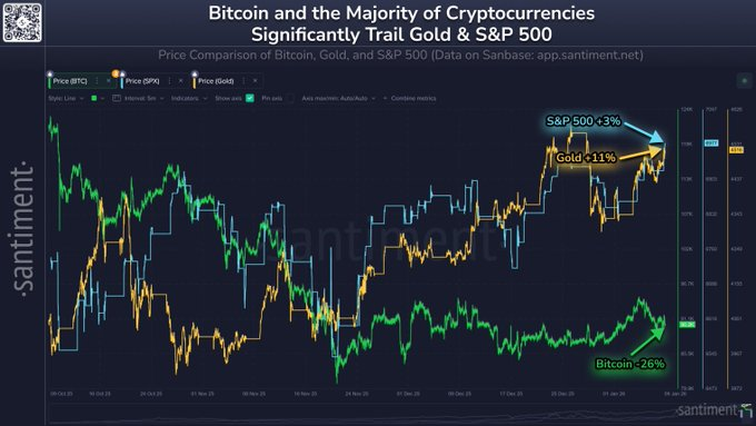 然而,短期市场数据却呈现出不一样的景象。Santiment 指出,自BTC在 10 月初触及近 12.6 万USD的历史新高以来,数字资产的表现一直落后于股票和贵金属。