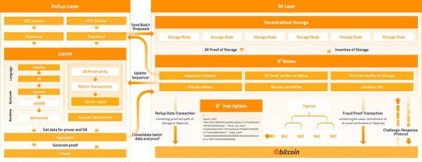 DA层包含去中心化存储,B²节点和BTC互联网,用于验证Rollup的零常识证明,永久存储Rollup层的数据的副本,并最后将数据通过铭文的方法刻印到BTC互联网中去。