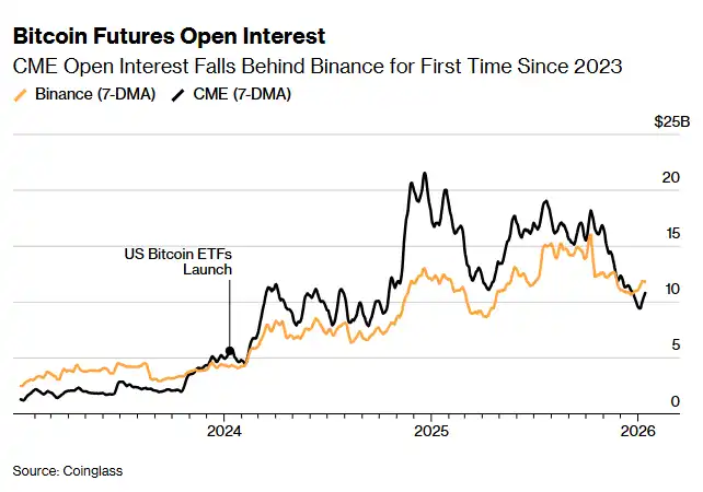 Tesseract 的 Harris 表示,历史上 CME 一直是机构资金与「现金与套利」(cash|and|carry)买卖的最佳选择场合。他补充说,CME 的未平仓合约规模被 币安 反超,「是一个要紧信号,说明市场参与结构正在发生转移」。他将目前形势形容为一次「战术性重置」,其背后缘由是收益走低、流动性变薄,而非市场信心动摇。