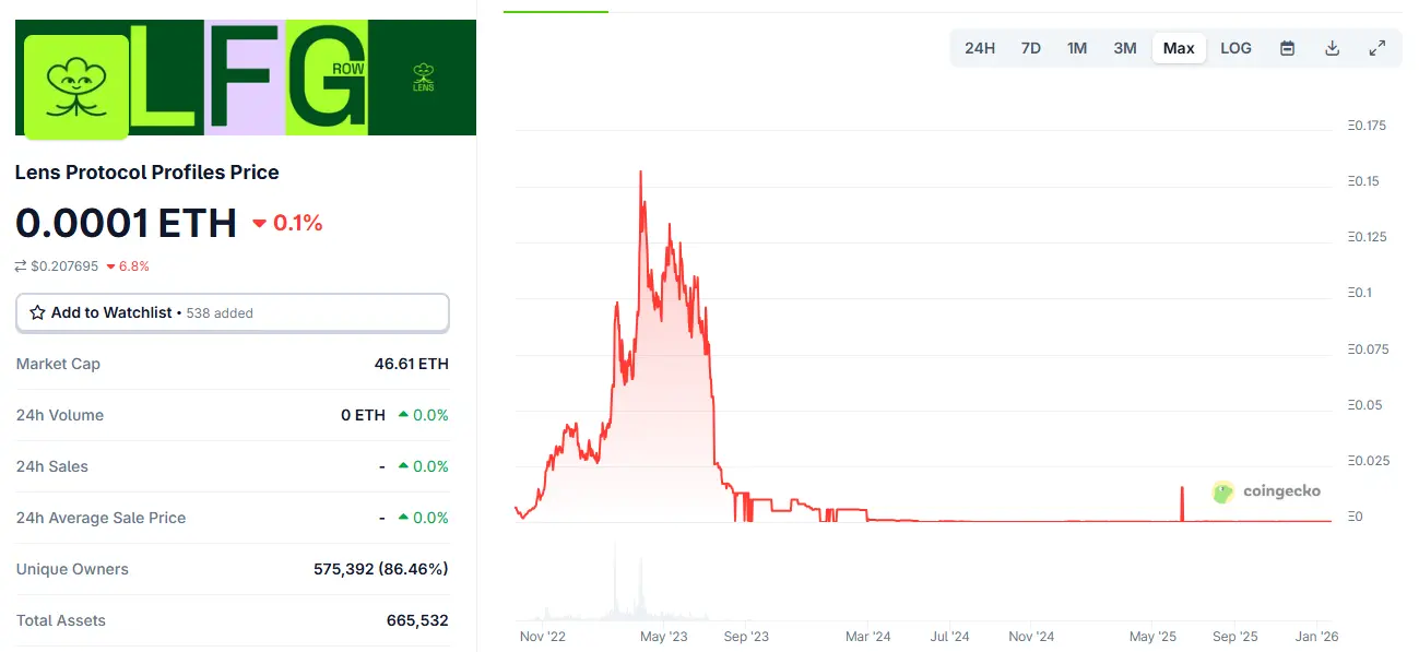 此前,Lens 官方在迁移公告中曾提到,2025 年 2 月该协议拥有约 64.7 万个已铸造的 Profile 账户,累计发布数达 3100 万条,但周活跃用户仅约为 4.5 万。这意味着,数十万的账户中可能大部分是早期为了博取潜在空投而注册,而真正产生优质互动的活跃用户占比甚微。