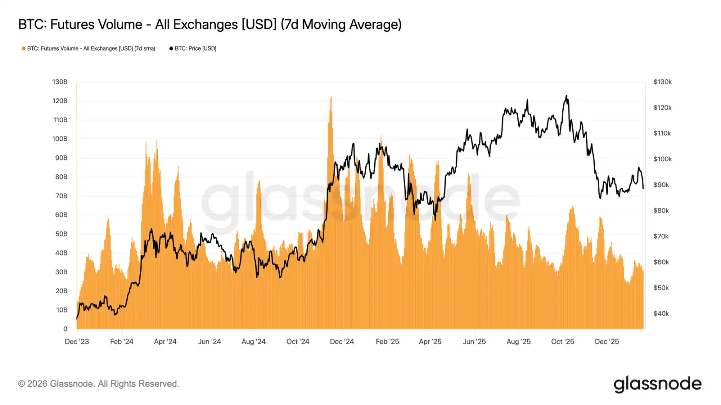 目前市场结构表明,最近的价格动作更多由稀疏的流动性驱动,而非激进的仓位布局。未平仓合约的调整也未随着成交量的同步增长,这更多反映了存量仓位的调整与风险再平衡,而非新增杠杆的投入。