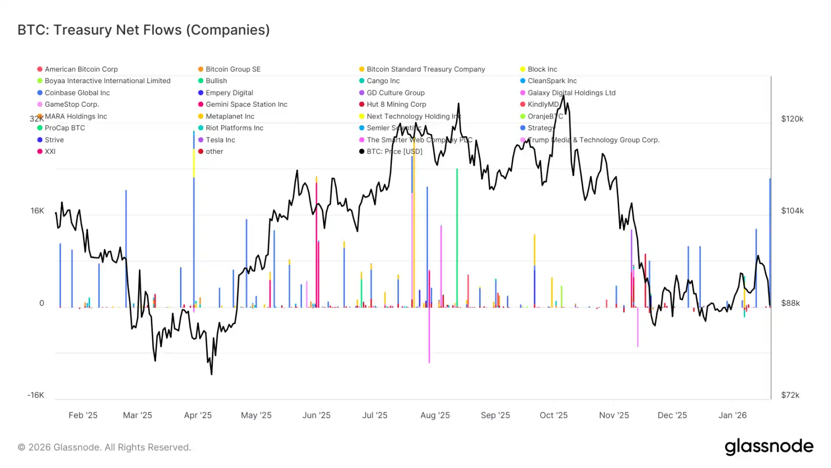 整体而言,数字资产财库资金流在零线附近窄幅波动,表明大部分企业库务现在处于观望或机会性操作状况,而非系统性增持。这与早期多个企业协同买入、推进趋势加速的阶段形成鲜明对比。