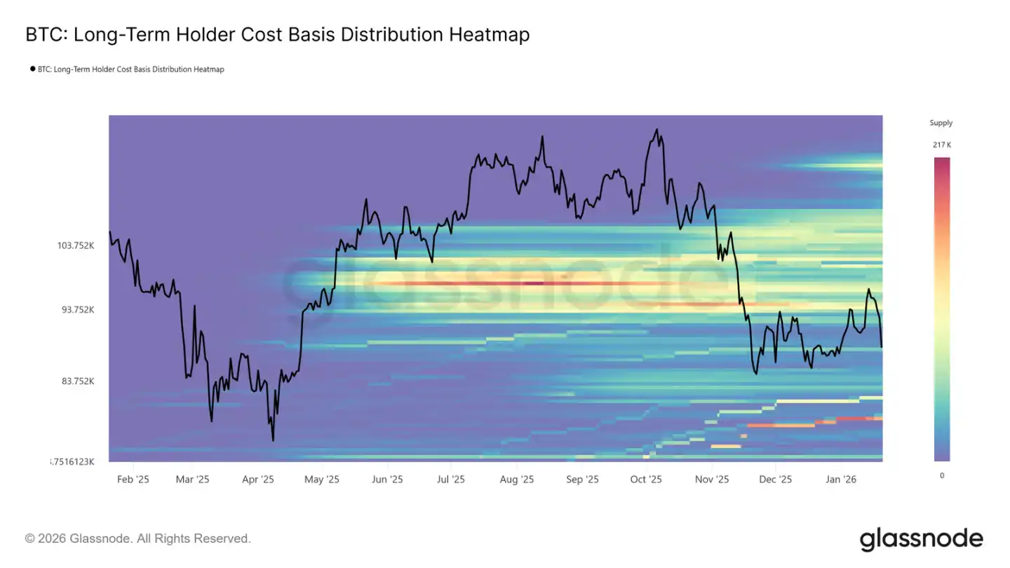 长期持有者本钱基础分布热力图显示,在目前现货价格上方,存在一个密集的长期持币本钱区。当价格反弹至这类历史买入价格时,该地区代表了巨大的潜在卖方流动性。