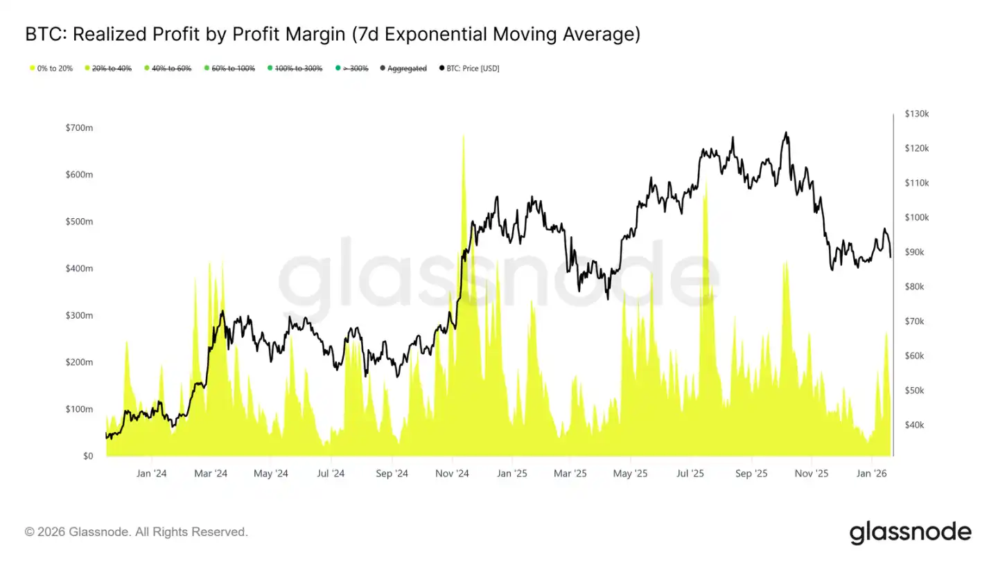 同时,按利率划分的达成收益数据表明,利率在 0% 至 20% 区间的获利了结占比显著上升。这凸显了「盈亏平衡卖家」和短期波段买卖者的影响,他们倾向于小幅盈利即离场,而非等待趋势延续。
