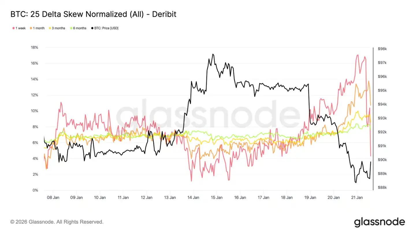 波动率曲线最前端的这种急剧陡峭化表明,买卖者正在进行战术性操作,而非重新评估中期风险结构。只有短期波动率调整,反映的是事件驱动的不确定性,而非整个波动率体系的转变。