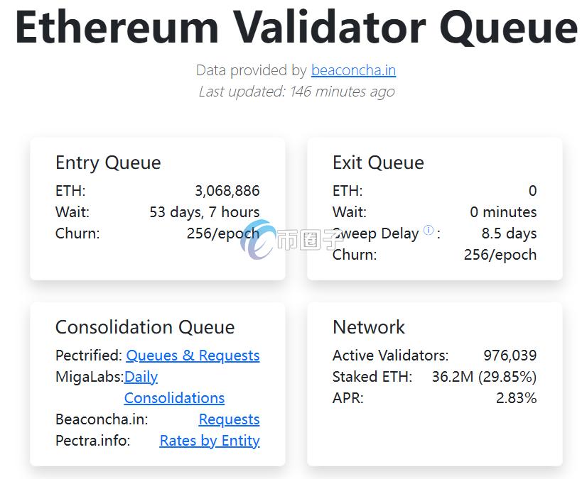 数据显示,现在入队等待质押的以太币数目约为3,068,886枚,在现行每一个epoch仅允许256枚以太币进入验证者队列的churn限制下,新质押者的预估激活等待时间已拉长至约53天7小时,意味着需等待近两个月,才能正式成为活跃验证者。