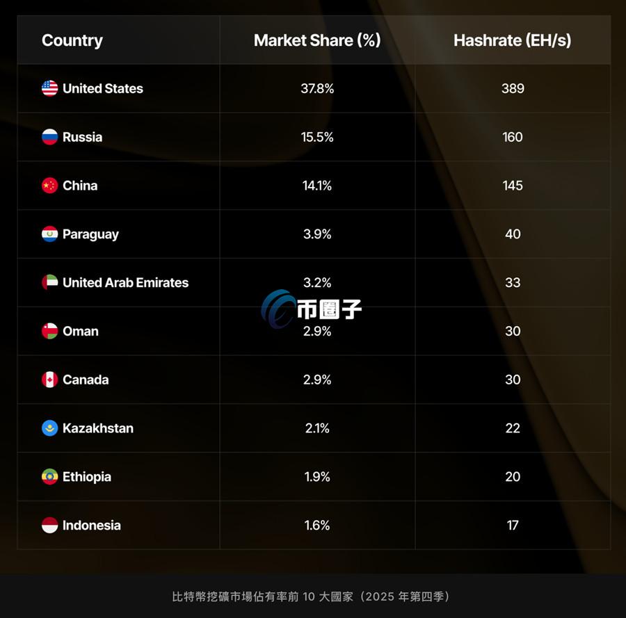 依据Hashrate Index 2025年第四季的数据,美国拥有全球近38%的算力,远超俄罗斯与中国。其中,得州、乔治亚州和纽约州是矿场最密集的区域。