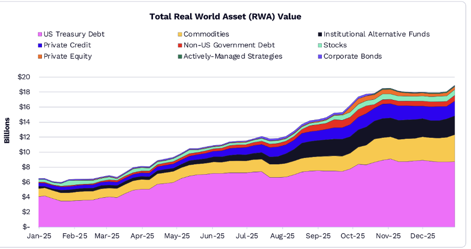 在美国国债和大宗产品的引领下,2025 年代币化资产市场规模增长两倍,达到 190 亿USD