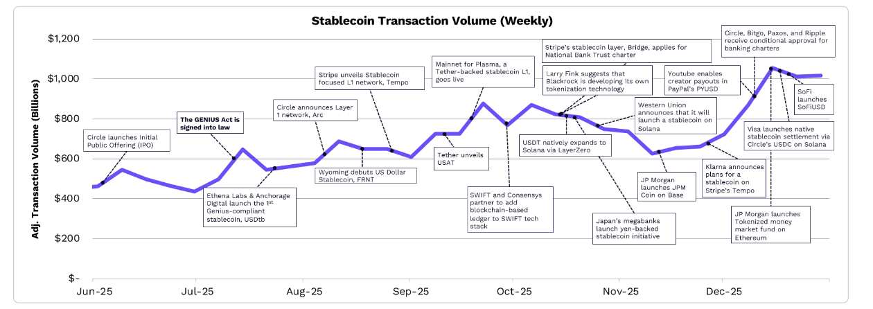 2025 年 12 月,调整后的稳定币买卖量的 30 天移动平均值为 3.5 万亿USD,是 Visa、PayPal 和汇款总额的 2.3 倍。
