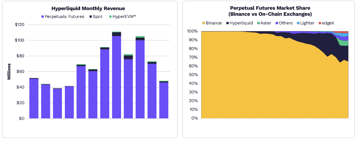 2025 年,Hyperliquid 在职员人数不超 15 人的状况下,年收入超越 8 亿USD。永续合约、稳定币和 Meme 币作为链上垂直范围,具备明确的商品市场契合度,可以大规模吸引用户和资本。