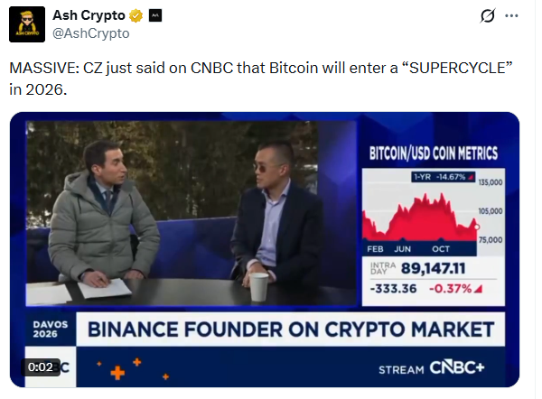 在Binance开创者赵长鹏(CZ)表示BTC可能马上打破其长期以来的四年周期后,BTC2026年超级周期已成为市场热议的焦点。赵长鹏在达沃斯世界经济平台期间同意CNBC采访时指出,机构投资者的广泛同意和监管政策的明朗化,或许会从根本上重塑BTC将来几年的走势。