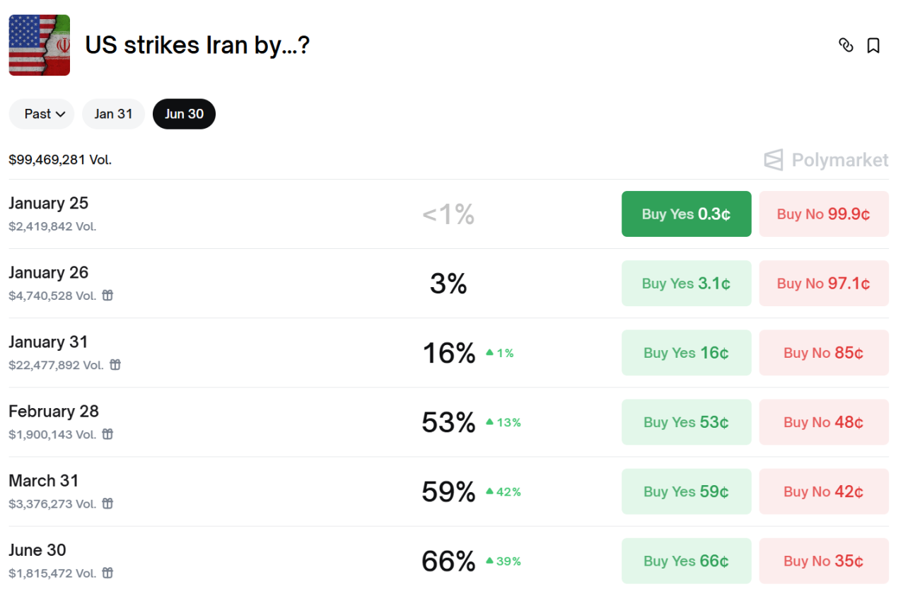 Polymarket 数据显示,市场押注美国将会在 2 月 28 近日对伊朗动武的概率已升至 53%。现在该预测市场成交额将近 1 亿USD。