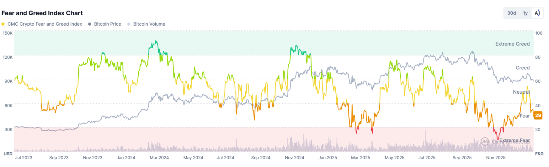 据 Coinglass 数据,过去 12 小时内,加密市场总爆仓金额高达 6.03 亿USD,其中多单爆仓 5.53 亿USD。恐慌指数现在报 29,处于“极端恐惧”区间。