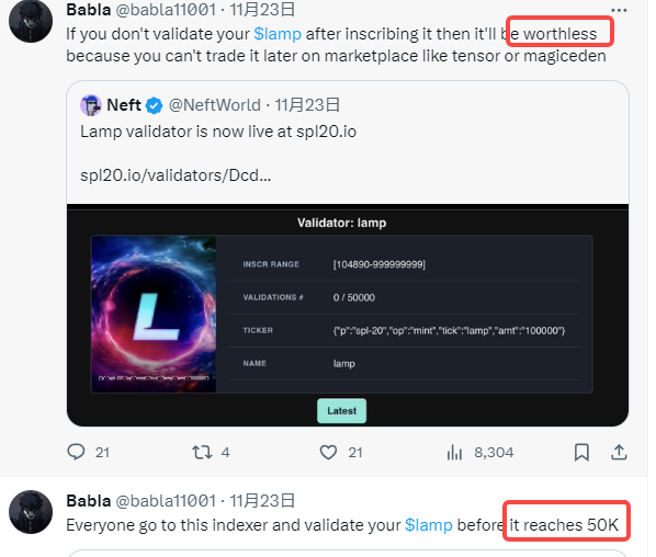 以昨天 SOL 上忽然蹿红的 Lamp 铭文为例,不同于 SOL 上之前的龙头铭文 Sols 有项目方积极喊单,Lamp 在毫无征兆的状况下由一位twitter用户 @babla11001 提出,遵循 SpL|20格式,总提供21万个,并以长推的形式发布了打铭文的步骤课程。