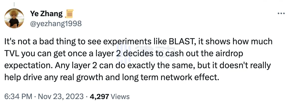 11 月 23 日,Layer 2 互联网 Scroll 联创 Ye Zhang在社交媒体上发文表示,像 Blast 如此的并非一件坏事,它向大家展示了,一旦 L2 决定兑现空投期望的时候,可以获得多少 TVL。任何 L2 都可以做一模一样的事情,但它并不可以真正帮助推进任何真正的增长和长期效应。