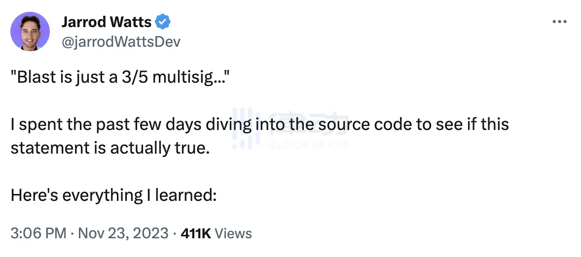 他表示,确实如 Jarrod Watts 所说,Blast 的合约是一个可升级合约,控制权是一个 3/5 多签且没时间锁。假如项目方要跑路,要么多签升级个恶意的逻辑合约,要么 enableTransition 设置个恶意的 mainnetBridge。