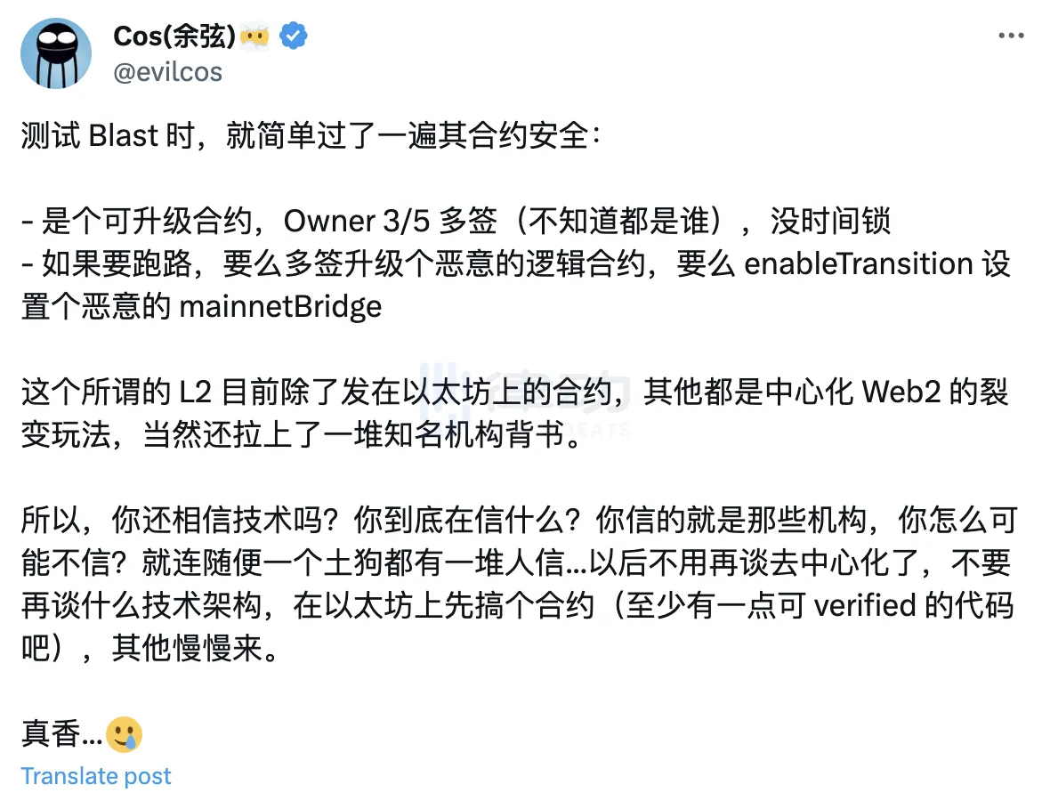 「没测试网、没买卖、没 bridge、没 rollup,也没向ETH发送买卖数据。假如控制该合约的 3/5 多签以后没『做正确的事』,用户将没办法在任何时候提取存到 Blast 合约里的钱。」