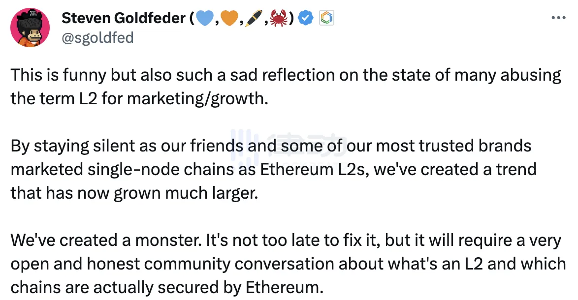Arbitrum 母公司 OffChain Labs 首席实行官 Steven Goldfeder对于很多人滥用 L2 一词进行营销/增长的近况感到悲哀。同时他指出,当大家将单节点链作为ETH L2 进行营销时,「大家维持沉默,大家创造了一种趋势」,而目前这种趋势已经变得更大。
