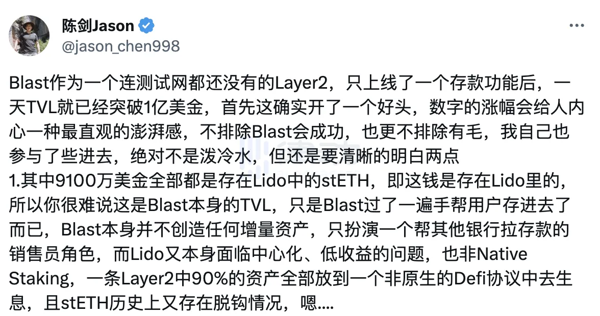 万物研究院的陈剑 Jason也持类似的看法,觉得虽然 Blast 存在种种问题,但也不影响用户参与进来。他在社交平台上发表动态指出,不排除 Blast 会成功,也更不排除有毛可薅,他一个人也参与了些进来,但用户需要明确地获悉其中的风险。