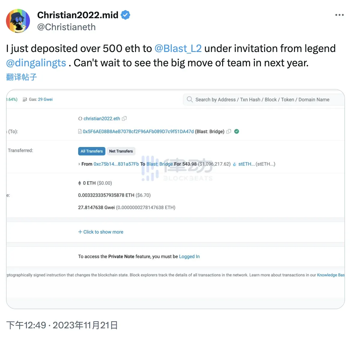 同时,加密基金 NDV 联合开创者、NFT 巨鲸 Christian也在社交媒体宣布,应另一知名 NFT 巨鲸 dingaling 的邀请,已向 Blast 存入逾 500 枚 以太币。同时,Christian 还表示对 Blast 团队在来年的表现寄予厚望。