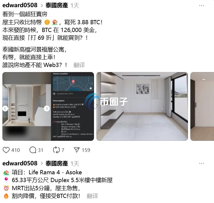 币圈子讯:Threads用户Edward Lai日前转发了一则卖房信息:泰国曼谷市中心全新高端河景公寓,屋主坚持「只收BTC」,并将价格硬性锁定在3.88枚比特币。该贴文指出,这笔买卖刚开始在BTC约12.6万USD时发出,现在BTC跌至约8.7万USD区间,换算下来,用户只需要支付原价约6.9折的价格即可入手,形同「现省30%」。Edward Lai表示:「有币就能直接上车!哪个说房产不可以Web3?」