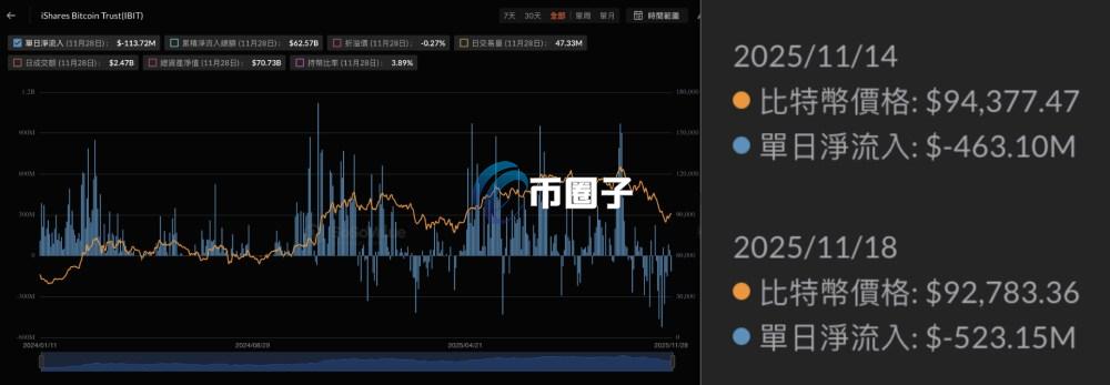 IBIT在11月净流出约23.4亿USD,其中最大两笔资金撤出发生在11月中旬,分别是11/14撤出约4.63亿USD,与11/18撤出约5.23亿USD。