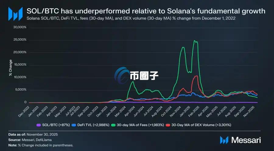 深入分析SOL的优秀表现,事实上它好像可能表现不佳。在SOL表现优于比特币87%的同一时期,SOL的基本面呈抛物线式增长。DeFi总锁仓量增长了2,988%,成本增长了1,983%,DEX买卖量增长了3,301%。以任何适当的标准衡量,自2025年底以来,SOL生态系统增长了20到30倍。然而,旨在捕捉这种增长的资产SOL,仅能比比特币多出87%的涨幅。