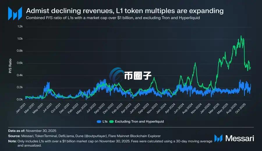 尽管存在这类相互角逐的估值框架,市场正日益透过货币溢价的视角,而非营收驱动的视角来评估L1。过去几年,所有市值超越10亿USD的L1的集体市销率维持相对稳定,一般在150倍至200倍之间。