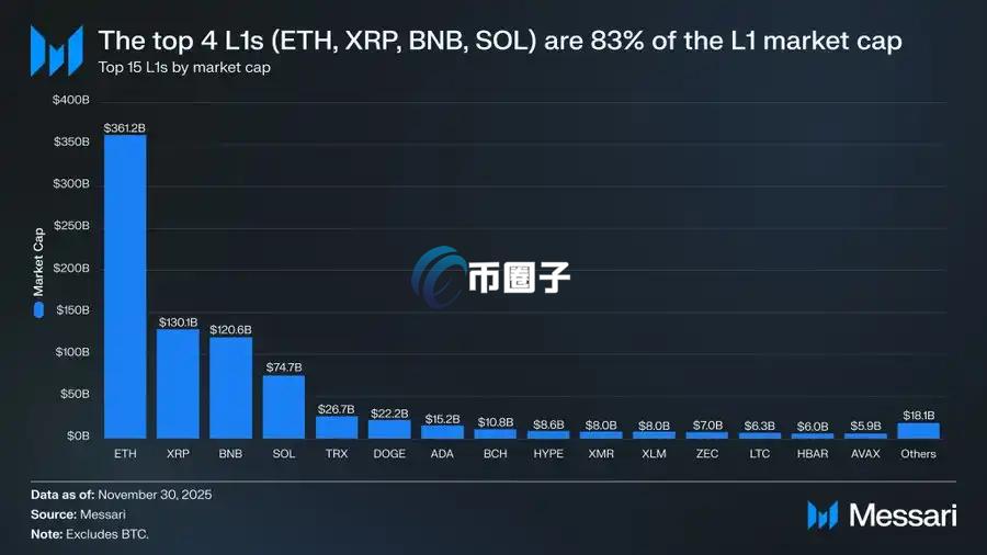 第一,看看L1现在的估值情况非常有帮助。前四大L1合计市值为6865.8亿USD,占替代性L1板块的83%。
