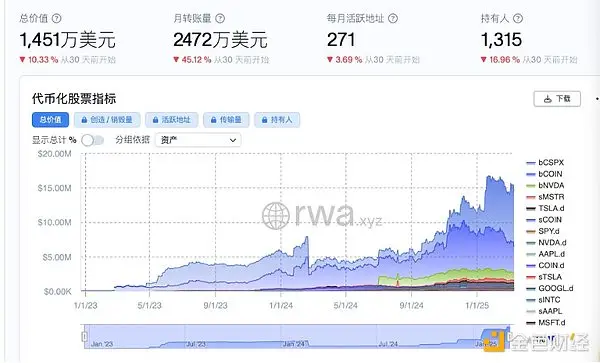 股票代币化不算是新鲜事,虽然早已有实践,但市场一直非常小。依据rwa.xyz的数据显示,现在股票上链的市值只有1451万USD,而排除稳定币, RWA商品的总体市值则是179.3亿USD。