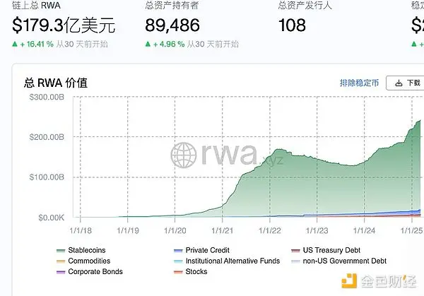Coinbase此举让实物资产代币化(Real World Assets,RWA)第三成为加密市场的热议话题。依据RWA.xyz的数据,截至2025年3月,排除掉稳定币,当下全球的RWA商品的总体市值已经达到了179.3亿USD。