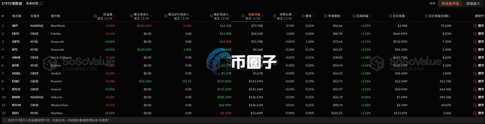 更引人关注的是,由全球资产管理龙头BlackRock发行的IBITETF,在11月18日单日竟录得5.23亿USD的净流出,这是自该基金上市以来最大单日资金撤出事件,单日减持规模约为5,630枚BTC。截至现在,IBIT的总资产净值仍居BTCETF之首,达727.6亿USD,但这样大规模的流出仍引发市场对其资金动能的质疑,也会是整体比特币 ETF资金信心下滑的风向球。