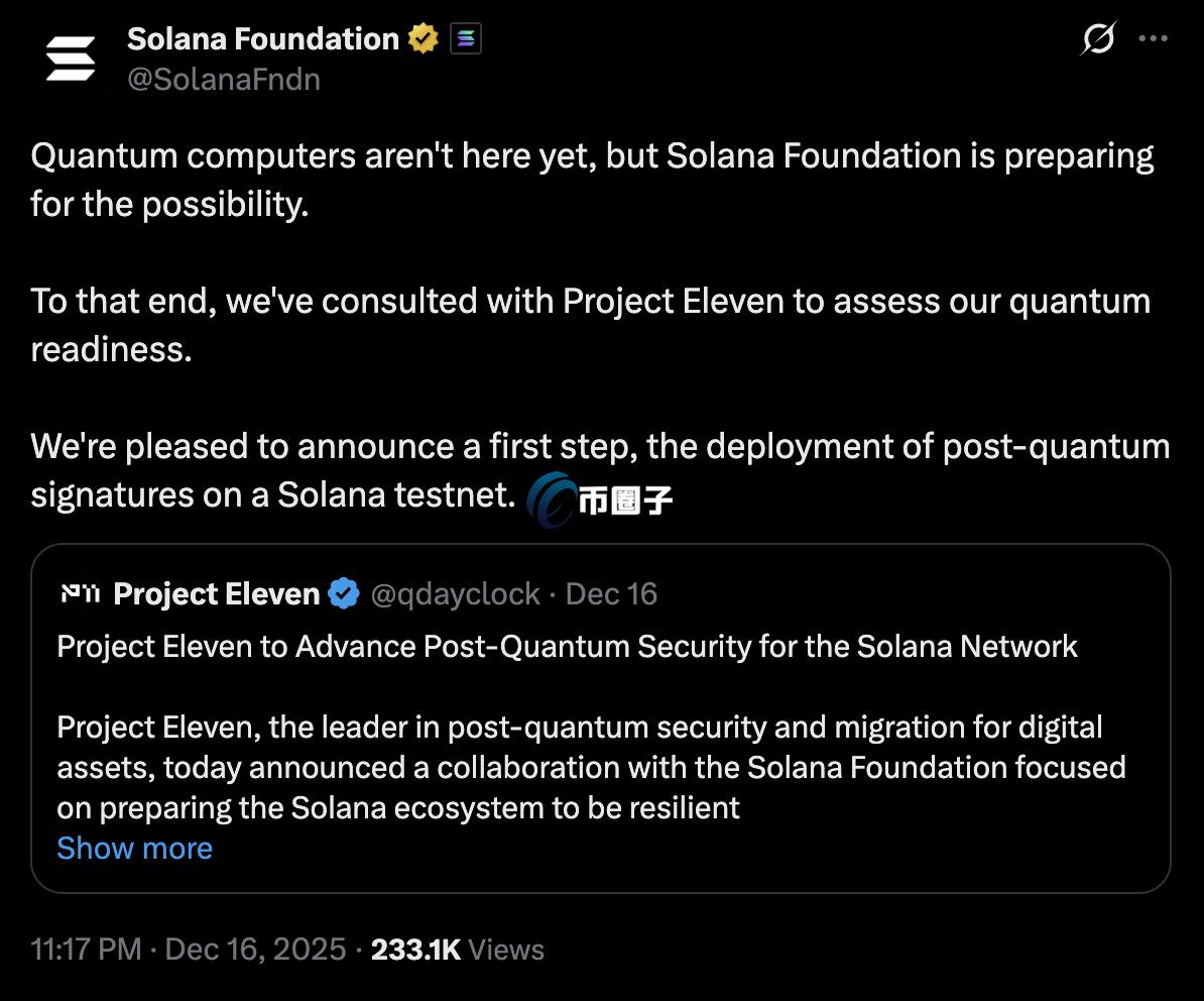 币圈子讯:SOL基金会最新宣布,已与后量子密码安全公司Project Eleven合作,在SOL测试网上实质测试「抗量子买卖」技术,并宣称这套设计在效能与可扩展性上拥有实质可行性。