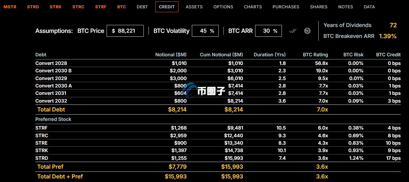 币圈子讯:BTC储备方案始祖微方案Strategy今年已募得208亿USD的高额资金,除去119亿USD的普通股,微方案今年推出五档永续优先股也是重大功臣,但8%以上的年化配息率也引发不少质疑,为了证明自己的付息能力,微方案官方网站上推出即时信息,证明以现在的BTC价格,公司有足够的资金支付72年的股息。而BTC价格每年超越1.39%的任何涨幅都将完全抵销微方案的年度股息支付义务。