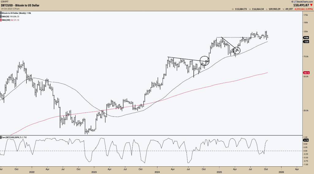 这一机会与历史规律相符,主要周期在达到峰值之前都会历程震动。BTC最近从十月6日12.63万USD的高点跌至11.1万USD,这意味着12%的回调,在达到让人欣喜的峰值之前,弱势的投资者被淘汰出局。这一周期既预示着风险,也预示着潜在的上涨空间。