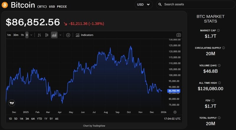 据报道,BTC周五买卖价格约为 87,200 USD,较 2025 年开盘价近 93,000 USD下跌约 6.5%。The Block 的价格数据尽管在十月初曾创下超越12.6万USD的历史新高,但在整个假期期间,价格行情走势依旧低迷,数字货币价格持续在9万USD下方波动。