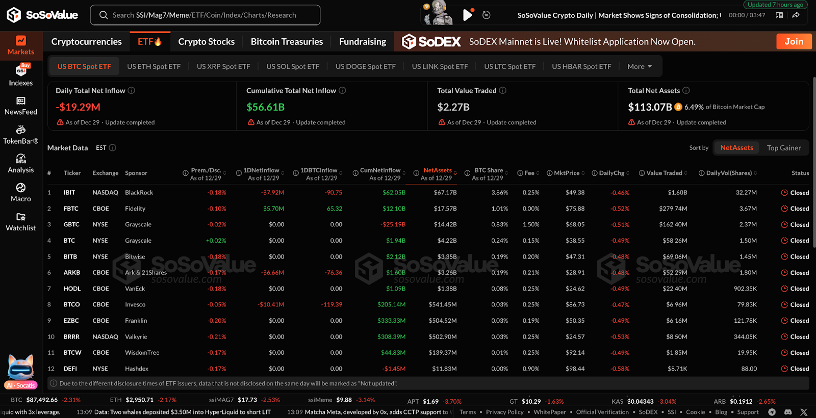 比特币 ETF资金流动(来源:SoSoValue)12月29日,美国现货BTCETF录得1930万USD的净流出,延续了机构投资者小心的持仓方案。当日总成交额为22.7亿USD,反映出市场活动稳定,但买盘信心有限。