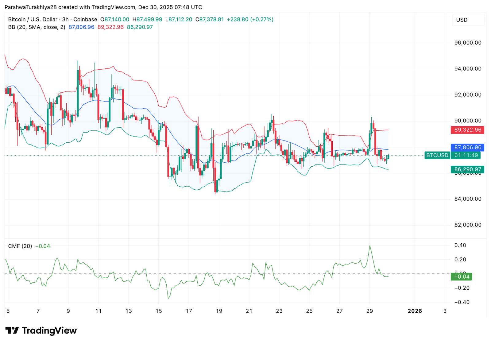 BTC最新价格接近 87,400 USD,守住短期支撑位,用户试图在正在形成的上升底部内稳定价格。市场仍受制于避险的现货资金流动和强劲的结构性需要,价格在 2025 年最后一个买卖日到来之际维持承压状况。