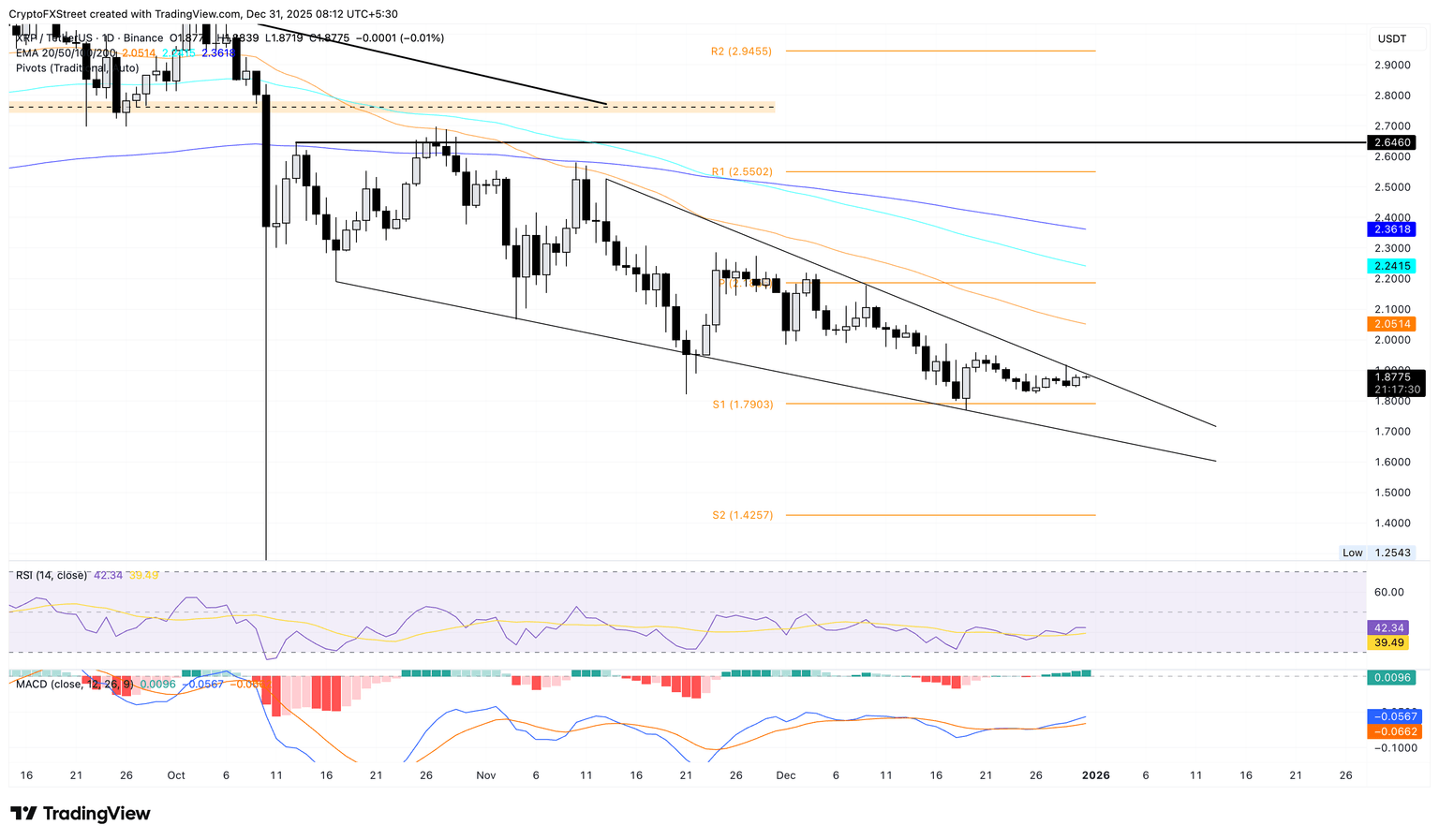 与ETH类似,Ripple/XRP在 1.90 USD附近,也就是连接 11 月 13 日和 12 月 9 日高点的阻力趋势线附近徘徊。这条趋势线在日线图上构成了一个降低楔形形态,而连接 10 月 17 日和 11 月 4 日低点的收敛支撑趋势线则与之形成对比。