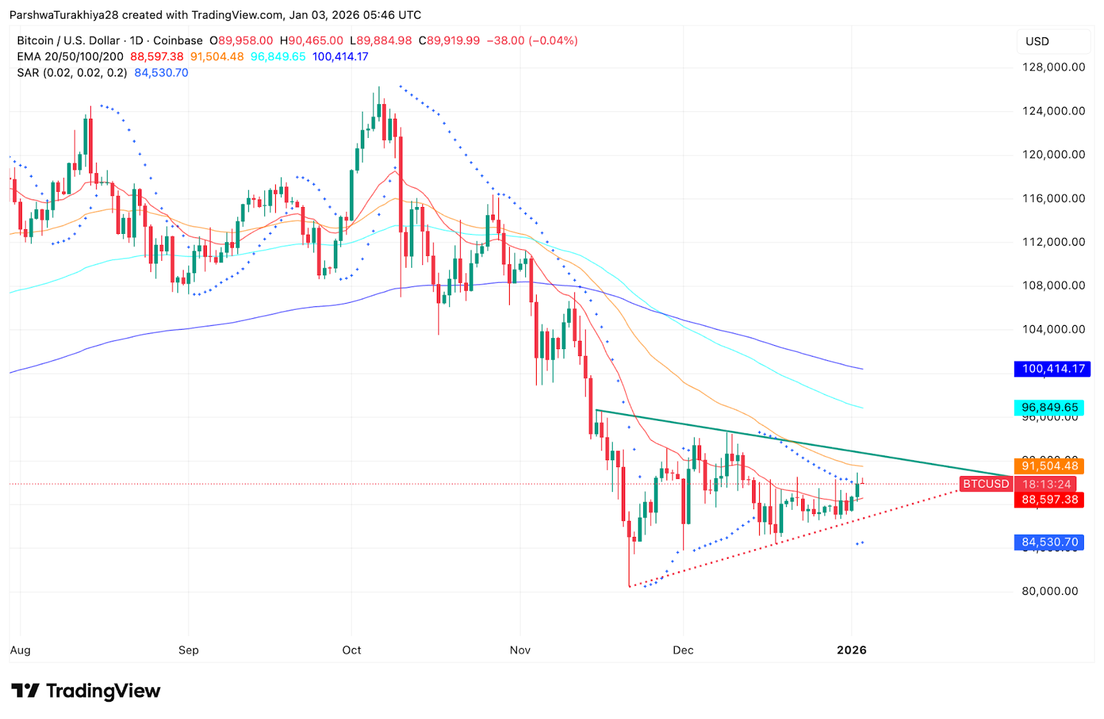 从11月高点绘制的降低趋势线仍然是主要的技术特点。价格在12月多次试图重新回到该趋势线附近,但每次都在91,000USD至92,000USD附近受阻,这进一步巩固了卖方的控制。抛物线转向指标(Parabolic SAR)仍然坐落于价格上方,表明下行重压尚未完全消除。
