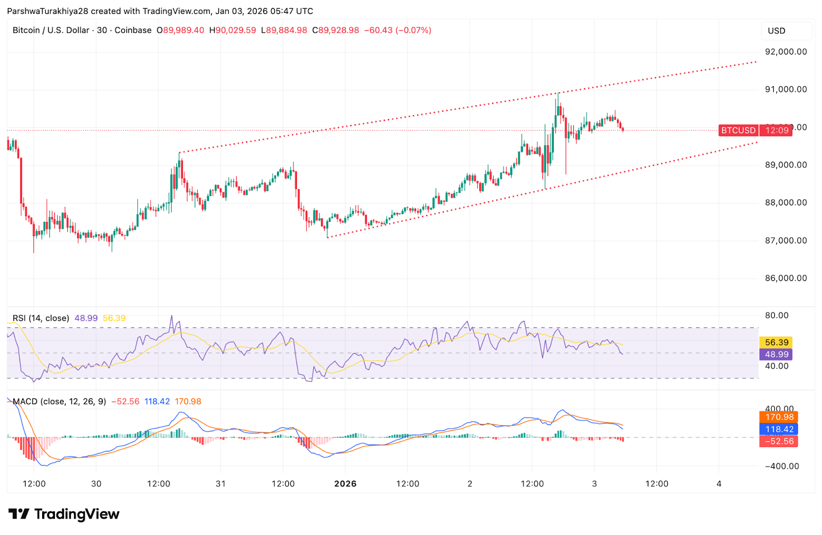 相对强弱指数 (RSI) 接近 49,反映出市场处于中性状况,而非强劲的上涨势头。移动平均收敛/发散指标 (MACD) 已转为小幅负值,表明在 12 月下旬冲击 91,000 USD之后,上涨动能飞速消退。