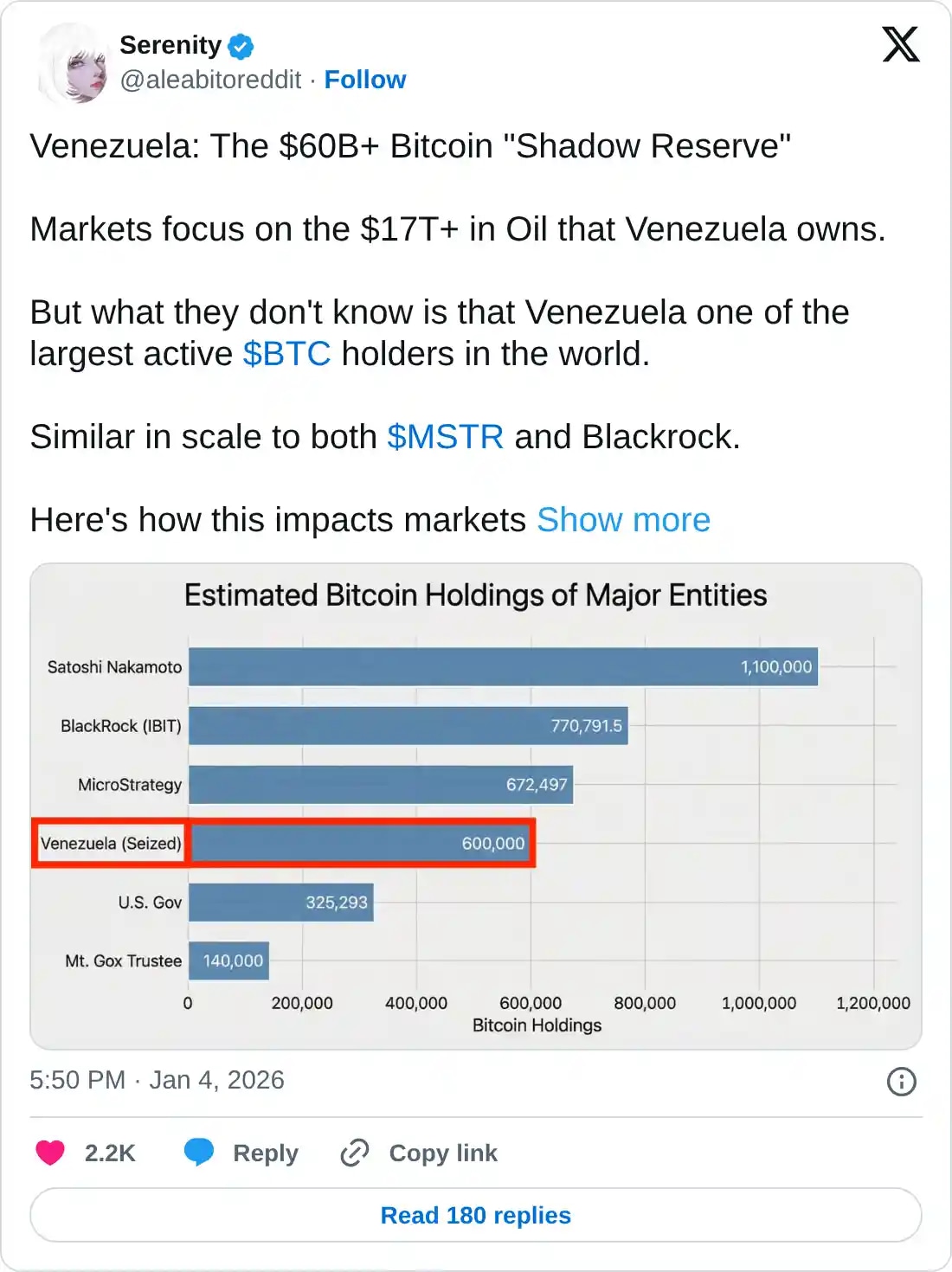 加上20亿USD金子考虑到 2025 年至 2025 年期间BTC的互换与 比特币 采矿扣押,委内瑞拉的影子储备可能持有大约 60 万个 比特币。