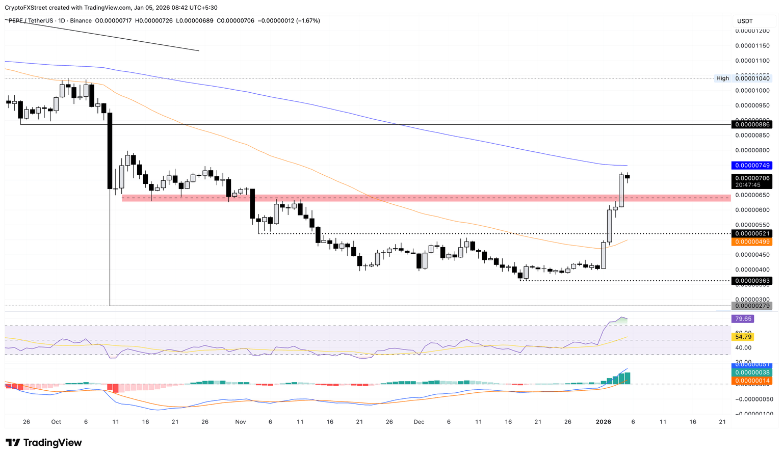 假如 PEPE 超越该移动平均线,则可能将涨势延续至 9 月 25 日低点 0.00000886 USD。