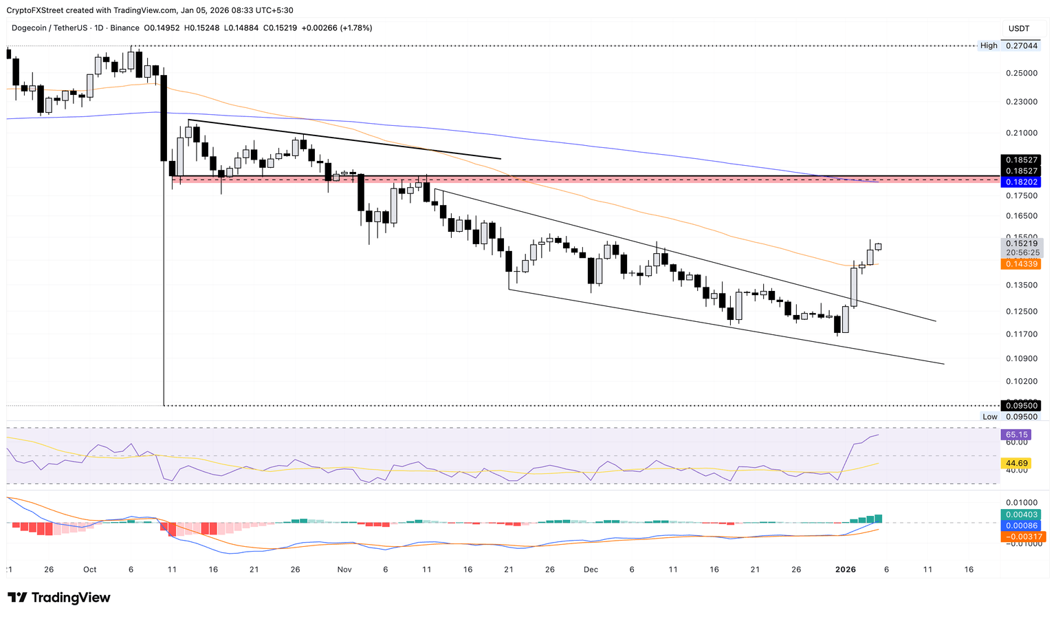 假如 狗狗币 跌破 0.14399 USD,则可能抵消突破性反弹,从而可能面临 0.13000 USD整数的风险。