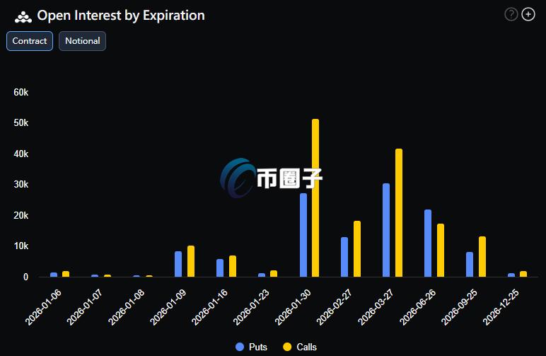 依据Coinbase旗下衍生性产品交易平台Deribit的数据,BTC期权市场的未平仓合约数目集中在1月30日到期、实行价为10万USD的合约,且买权比卖权的数目高出很多。