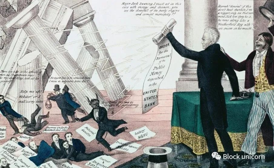 这类事件引发了公众的愤怒,也让充满火药味的民粹主义者杰克逊将废除银行作为他的竞选重点。